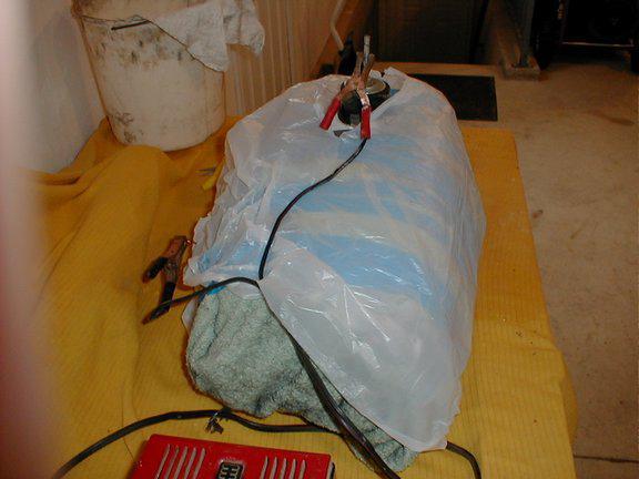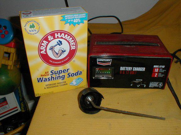 The second photo shows the basic equipment; a battery charger, the (freshly cleaned) anode and the mix for the electrolyte. The Arm & Hammer product wasn’t particularly easy to find, but I eventually tracked it down at a very large mega-superstore (Meijer). It’s cheap so I bought two boxes – just to be sure I have a future supply.